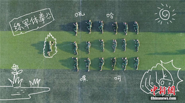 學(xué)子們正在練習(xí)軍體拳,一招一式不馬虎。陳可涵 攝 劉少航 繪