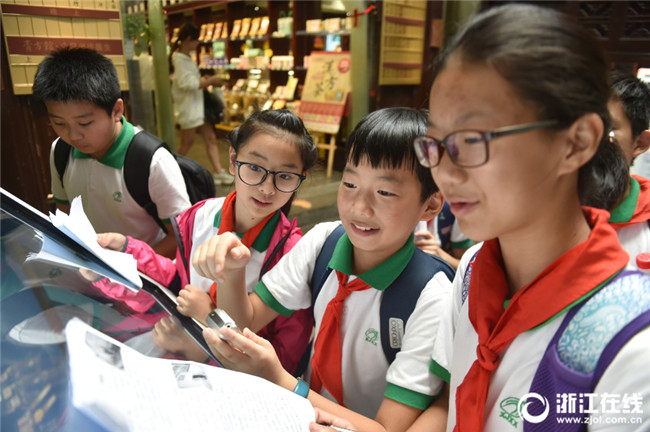 一個(gè)課題小組在清河坊方回春堂了解國(guó)醫(yī)國(guó)藥文化。