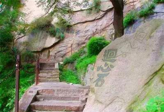 韓愈投書處:從北峰上行,過擦耳崖,爬天梯,就到了蒼龍嶺,這處地方就像它的名字一樣,仿佛是一條蒼龍用它的背脊架起了這條路,路面極之狹窄,若有人迎面擦肩而過,最好大家互相背靠背遷就一下,免生危險。蒼龍嶺的山脊上下高差約五百米,山坡傾斜度達(dá)45度,兩旁山谷,深不可測,據(jù)說唐代韓愈當(dāng)年上山到了此地,見山高勢險,以為自己必死無疑,于是寫下遺書,投往山下,所以大家會發(fā)現(xiàn)路旁一塊巨石之上,寫有“韓愈投書處”的字樣。
