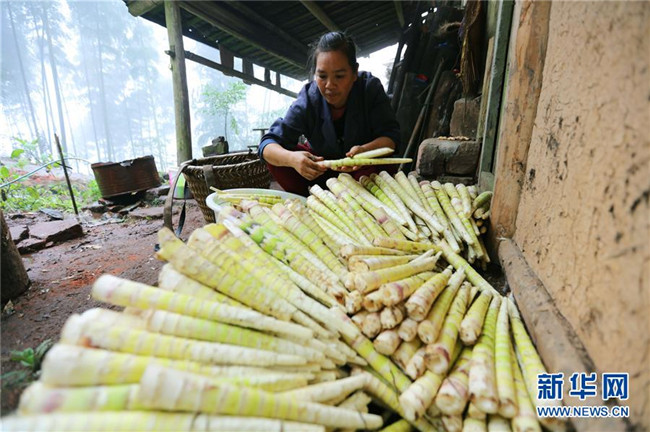 10月14日,在貴州赤水市寶源鄉(xiāng)聯(lián)華村,竹農(nóng)為鮮筍去殼。金秋時(shí)節(jié),貴州省赤水市寶源、兩河口、丙安等鄉(xiāng)鎮(zhèn)種植的5萬余畝大竹筍迎來收獲季。當(dāng)?shù)刂褶r(nóng)加緊采挖竹筍,進(jìn)行加工后外銷。素有“中國竹子之鄉(xiāng)”的赤水市,現(xiàn)有竹林面積132.8萬畝。竹產(chǎn)業(yè)已經(jīng)成為當(dāng)?shù)孛撠氃鍪盏闹饕乐弧?(王長育 攝)