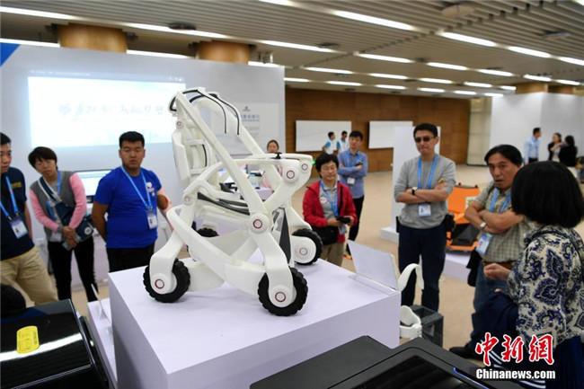 10月13日,第四屆中國“互聯網+”大學生創(chuàng)新創(chuàng)業(yè)大賽總決賽在廈門大學舉行。無人機、自助售飯機、人偶互動、全息3D智能視頻、機器人輪椅、3D打印假肢手臂等大學生研發(fā)設計的產品亮相會場,以“90后”為主的創(chuàng)新創(chuàng)業(yè)生力軍已全面發(fā)力,釋放出“青年+創(chuàng)新創(chuàng)業(yè)”的無窮力量。圖為3D打印個性化定制機器人輪椅展示。中新社記者 王東明 攝