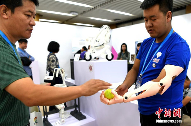 10月13日,第四屆中國“互聯網+”大學生創(chuàng)新創(chuàng)業(yè)大賽總決賽在廈門大學舉行。無人機、自助售飯機、人偶互動、全息3D智能視頻、機器人輪椅、3D打印假肢手臂等大學生研發(fā)設計的產品亮相會場,以“90后”為主的創(chuàng)新創(chuàng)業(yè)生力軍已全面發(fā)力,釋放出“青年+創(chuàng)新創(chuàng)業(yè)”的無窮力量。圖為3D打印假肢手臂展示。中新社記者 王東明 攝