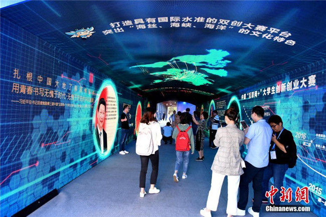 10月13日,第四屆中國“互聯網+”大學生創(chuàng)新創(chuàng)業(yè)大賽總決賽在廈門大學舉行。本屆大賽于今年3月份啟動,迄今累計已有近265萬大學生、63萬個團隊參賽,涌現出一大批科技含量高、市場潛力大、社會效益好的高質量項目,以“90后”為主的創(chuàng)新創(chuàng)業(yè)生力軍已全面發(fā)力,釋放出“青年+創(chuàng)新創(chuàng)業(yè)”的無窮力量。圖為創(chuàng)新隧道亮相廈大校園。中新社記者 王東明 攝