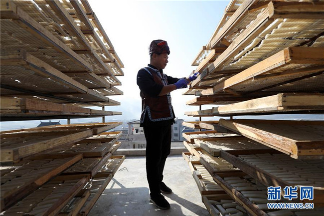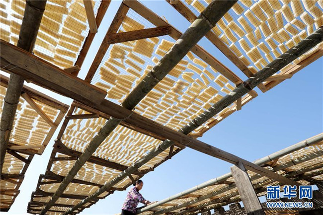11月4日,在貴州省黎平縣中潮鎮(zhèn)佳所侗寨,村民在晾曬“侗果”粑塊。 近日,貴州省黔東南苗族侗族自治州黎平縣中潮鎮(zhèn)佳所侗寨的村民們搶抓晴好天氣,忙著制作、晾曬“侗果”,侗寨里一派忙碌。“侗果”是當(dāng)?shù)囟弊逋捅貍涞奶厣朗?,是將蒸熟的糯米切成小粑塊后,再經(jīng)曬干、油炸、澆紅糖和上芝麻等工序制作而成。 新華社發(fā)(楊代富 攝)