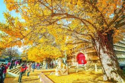 金秋時節(jié),京城各公園和景區(qū)落葉繽紛,美景如畫。昨天,北京石刻藝術(shù)博物館內(nèi)的真覺寺金剛寶座旁,兩株樹齡近600歲的古銀杏樹一片金黃,吸引市民觀賞留影。本報記者 武亦彬攝