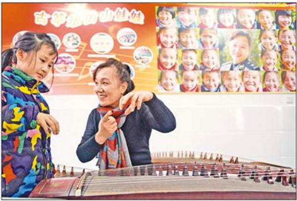 安徽省金寨縣梅山鎮(zhèn)小南京村“山娃娃古箏班”創(chuàng)辦4年來,為三十幾名留守兒童帶來溫暖。創(chuàng)辦人俞曉冬原為南京軍區(qū)前線文工團(tuán)國(guó)家一級(jí)古箏演奏家。2014年,她自籌資金20多萬元購(gòu)置40多架古箏,在小南京學(xué)校建起一間古箏教室,利用音樂課、課余和周末時(shí)間無償對(duì)山村留守兒童進(jìn)行古箏培訓(xùn)和音樂教育。一年中,俞曉冬有150多天都住在學(xué)校,與山娃們朝夕相處,孩子們親切地稱她為“古箏媽媽”。一批批山娃娃在小學(xué)畢業(yè)前通過全國(guó)器樂水平十級(jí)考試,還多次參加國(guó)內(nèi)公益演出。圖為俞曉冬老師在教留守兒童學(xué)古箏。(趙樹宴/攝)