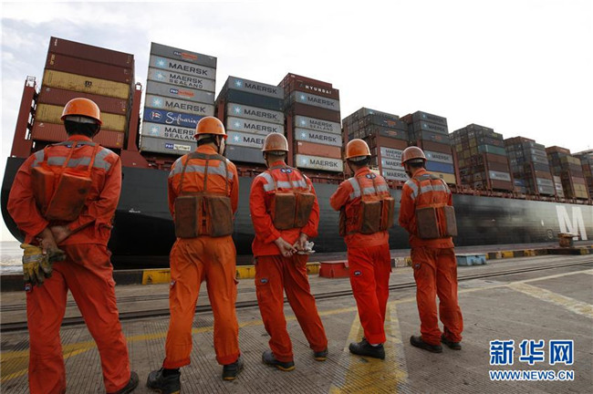 工人列隊(duì)走過(guò)一艘停泊在洋山深水港碼頭的集裝箱船(2017年9月13日攝)。新華社記者方喆攝