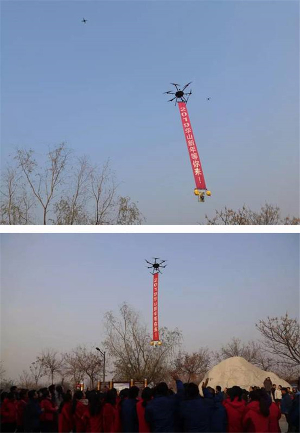 啟動(dòng)儀式上,華山景區(qū)還為活動(dòng)前期征集的十名幸運(yùn)游客送上新年大禮包,讓跨年登山的游客享受到華山的新年祝福。同時(shí),為了配合活動(dòng)效果,讓華山新年更具新意,現(xiàn)場(chǎng)出動(dòng)三架無(wú)人機(jī)進(jìn)行空中表演,更是以語(yǔ)音播報(bào)及橫幅展示的方式為現(xiàn)場(chǎng)游客送上新年寄語(yǔ)。