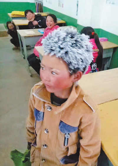 去年初,小滿因?yàn)轭^頂著冰霜上學(xué)而被稱為“冰花男孩”?!≠Y料圖片 |