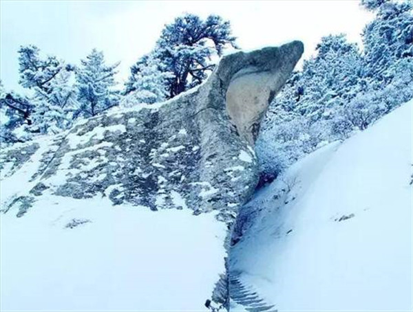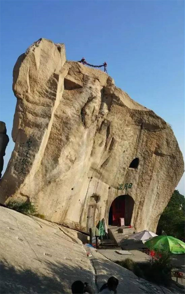 看過(guò)金庸武俠小說(shuō)的童鞋們,一定聽(tīng)過(guò)全真教。那么全真崖呢?它位于南天門(mén)西,為松檜峰頂向南懸空傾伸之崖石。出南天門(mén)越長(zhǎng)空棧道可至崖下。崖腹部有賀老石室,是元初道士賀志真開(kāi)辟的修行之地?!赌戏逵洝分杏浭觯?ldquo;巖類(lèi)俯首形,遙覆室上,上書(shū)“全真巖”三字,赤色以實(shí)之。雖知人所為,然上不可下,下不可上,其履虛而作之邪?何其神也!”