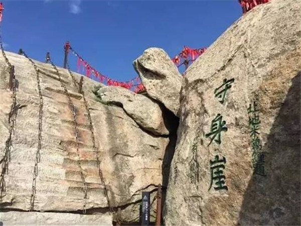 位于華山西峰頂摘星石北。民間傳說(shuō)古時(shí)有個(gè)孝子,雙親身染重疾,久治不愈,聽(tīng)說(shuō)岳神靈驗(yàn),便登山拜神求醫(yī)。在向岳神祈禱的過(guò)程中,孝子許愿說(shuō)只要雙親病愈,愿舍去自己的性命來(lái)報(bào)答神靈。果然,當(dāng)孝子返回家中時(shí),父母都已康復(fù),且已下田耕作去了。孝子還愿來(lái)到華山,毫不猶豫的從此處跳下深淵,可他卻覺(jué)得身體若有人托起,似乘長(zhǎng)風(fēng),飄飄欲仙。待清醒時(shí),原來(lái)依然躺在家中,似夢(mèng)非夢(mèng)。孝子知道是華山神暗中相助,便告別父母到華山西峰作了道士。后人被孝子的誠(chéng)心感動(dòng),就將此處命名為舍身崖。 清道光年間李榕的伯祖李仁龍為阻止后人仿效孝子的行為,改舍身崖為省身崖,以警示忤逆之街徒游到這里時(shí)應(yīng)對(duì)照孝子,自警自省,痛改前非。后來(lái)又有人認(rèn)為舍身救雙親的行為并不可取,也稱(chēng)崖作守身崖,以教育后人生命可貴,不可輕擲。