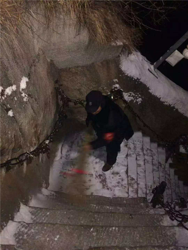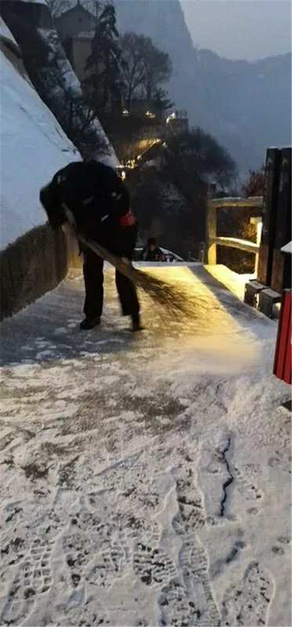 2019年元月4日,在小寒節(jié)氣到來之前,一場應景的小雪降落在華山,華山主峰區(qū)的工作人員第一時間清掃積雪,為游客的安全保駕護航。
