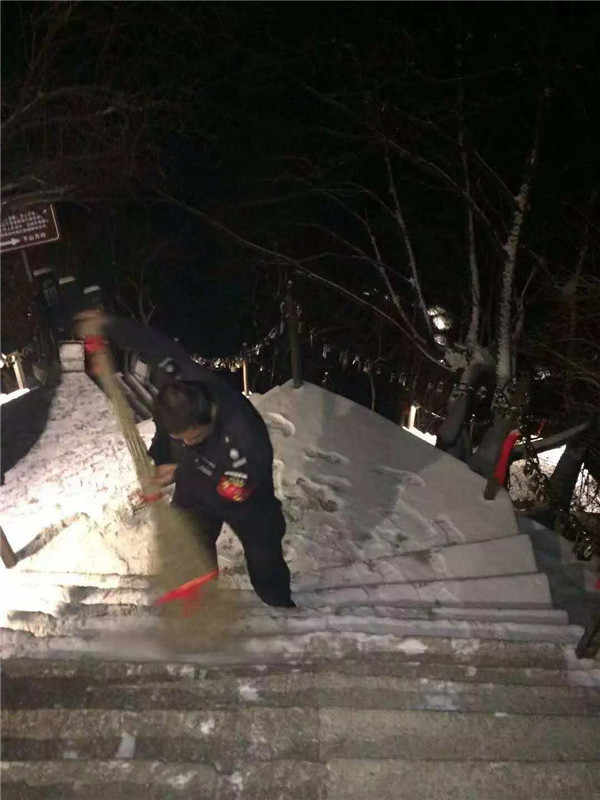 天還沒亮,主峰區(qū)的工作人員,分路段開始清掃積雪。