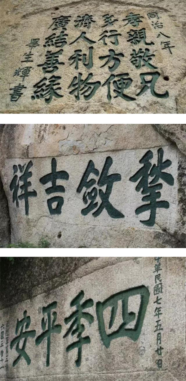 華山素有“空中書法藝術走廊”之美譽。在登山沿途各景點峭壁石巖上遍布著歷代文人墨客和游者留下的內(nèi)容十分豐富、風格各異、藝術價值非常高、教化意義也非常積極的摩崖石刻,形成了蔚為壯觀的石刻藝術景觀,成為華山旅游文化一個十分突出的內(nèi)容。前人記述華山石刻“自古稱富”。自春秋戰(zhàn)國時期,秦昭王令工匠施鉤梯登華山勒石起至今,約570多則,有年可考255則,宋代以前的摩崖石刻多已無存,然而宋以后的大多數(shù)保留完好。其中宋代10則,元代4則,明代42則,清代63則,民國時期112則,當代30則,其余無年可考。