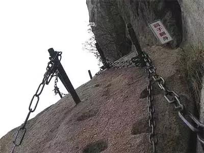鷂子翻身:在華山東峰,是通往下棋亭的必由之路,為華山著名的險(xiǎn)道之一。其路鑿于倒坎懸崖上,下視唯見寒索垂于凌空,不見路徑。游人至此,須面壁挽索,以腳尖探尋石窩,交替而下,其中幾步須如鷹鷂一般、左右翻轉(zhuǎn)身體才可通過,故名鷂子翻身。