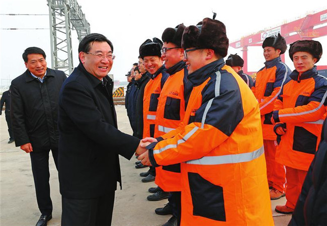 二月十一日,省委書記胡和平在西安市調(diào)研樞紐經(jīng)濟(jì)、門戶經(jīng)濟(jì)、流動(dòng)經(jīng)濟(jì)發(fā)展情況。圖為他在西安鐵路集裝箱中心站慰問春節(jié)期間堅(jiān)守一線的中歐班列長安號工作人員。本報(bào)記者宋紅梅攝