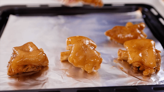 6.將烤盤上鋪上錫紙,并在錫紙上抹上一層薄薄的油,防止烤的時候豬蹄會粘在錫紙上,放上煮好的豬蹄。