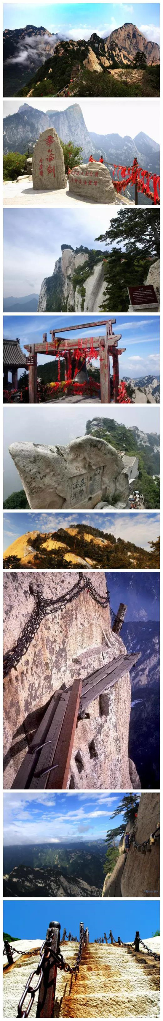 【圖2 北峰華山論劍碑、圖3 華岳仙掌、圖4南峰平安鐘、圖5 蒼龍嶺西北屏障、圖7、8長空棧道】