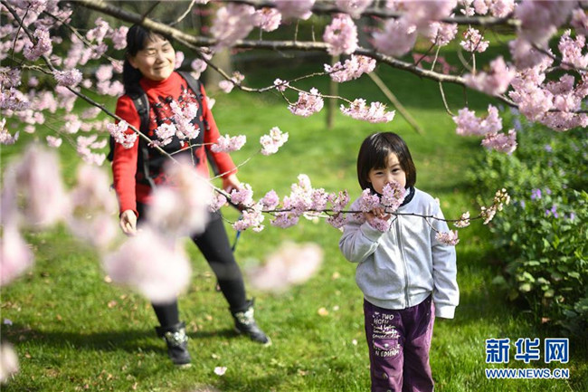 3月13日,一名小朋友和家人在武漢東湖櫻園賞櫻。新華社記者 熊琦 攝