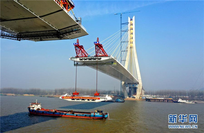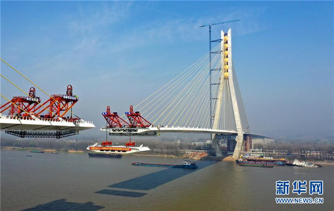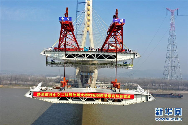 安徽池州長江公路大橋主橋長5.8千米,為雙塔雙索面斜拉橋,主跨828米,是連接安徽長江兩岸的又一條快速通道,預計3月底實現(xiàn)主橋合龍,6月底具備通車條件。