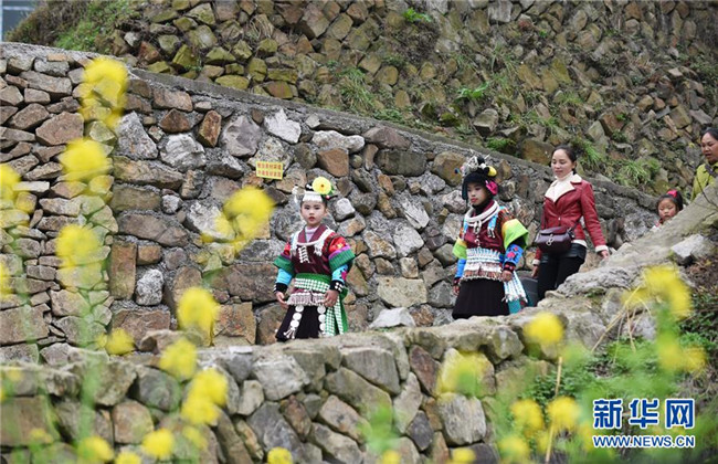 3月16日,在丹寨縣南皋鄉(xiāng)清江村,苗族姑娘在前往參加翻鼓節(jié)活動(dòng)途中。 當(dāng)日,貴州省黔東南苗族侗族自治州丹寨縣南皋鄉(xiāng)清江村清江村舉行翻鼓節(jié)。翻鼓節(jié)是當(dāng)?shù)孛缱宕迕裼哟焊絹淼拿袼坠?jié)日,至今已有近600年歷史,每年農(nóng)歷二月舉行。 新華社記者 楊文斌 攝