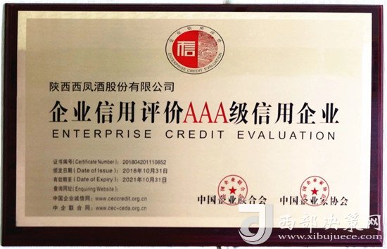 西鳳股份公司榮獲全國“AAA級信用企業(yè)”榮譽(yù)稱號(hào)