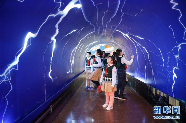 3月22日,學(xué)生在合肥市氣象科普館體驗(yàn)?zāi)M的雷電場景。