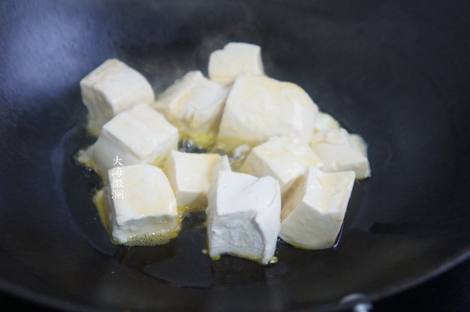 4.炒鍋加入適量的油,每一片豆腐都裹上蛋液,入鍋煎