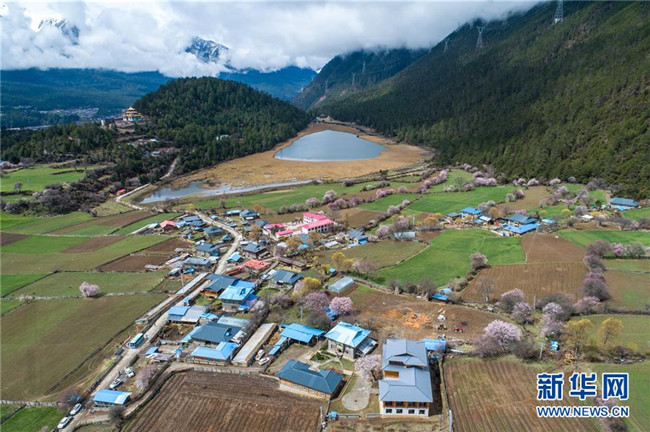 這是波密縣古鄉(xiāng)嘎朗村的田園風(fēng)光(4月2日無(wú)人機(jī)拍攝)。新華社記者 李鑫 攝