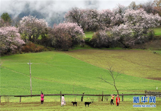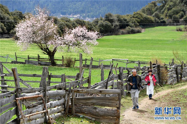 4月2日,游客在波密縣古鄉(xiāng)嘎朗村游玩。 新華社記者 李鑫 攝
