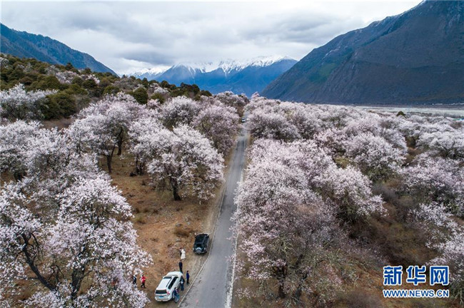 4月2日,游客在波密縣桃花溝游玩(無(wú)人機(jī)拍攝)。  新華社記者 李鑫 攝