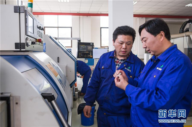 這是李斌(右)在查看工友加工的零件質(zhì)量(資料照片)。新華社發(fā)