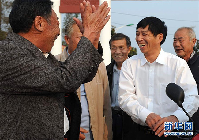 這是2008年10月7日,沈浩(前右)與大包干帶頭人關(guān)友江、嚴(yán)俊昌、嚴(yán)金昌、嚴(yán)學(xué)昌交流小崗村的改革發(fā)展情況。新華社記者 王雷 攝