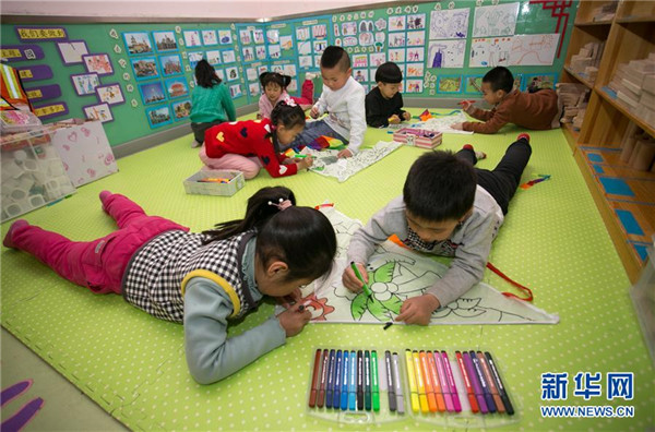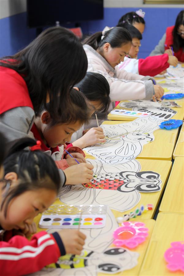 4月3日,山東臨沂市郯城縣郯城街道十里小學(xué)的學(xué)生在繪制風(fēng)箏。 新華社發(fā)(張春雷 攝)