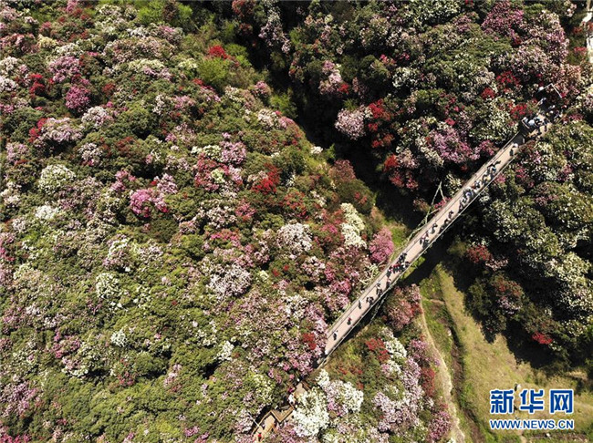 4月7日,游客在貴州省畢節(jié)市百里杜鵑金坡景區(qū)游覽(無人機拍攝)。清明時節(jié),人們外出旅游,踏青賞花,感受春天的美好。 新華社發(fā)(韓賢普 攝)