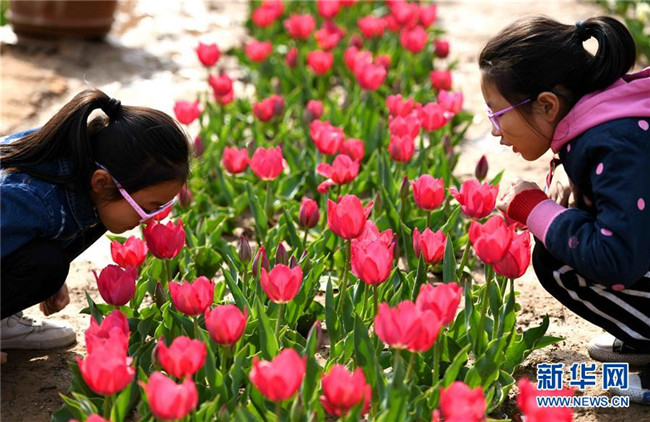 4月7日,在石家莊市植物園,兩名小游客欣賞盛開的花朵。清明時節(jié),人們外出旅游,踏青賞花,感受春天的美好。 新華社發(fā)(陳其保 攝)