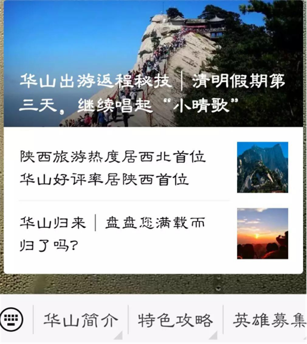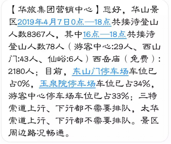 景區(qū)節(jié)日期間通過電子大屏、官方微博、微信、短信平臺向游客和各單位提供實(shí)時登山排隊(duì)人數(shù)、車位、天氣等信息。(小長假期間新浪微博共計(jì)發(fā)送微博48條,網(wǎng)友留言及回復(fù)361條,閱讀量共計(jì)421446余次;微信公眾平臺共計(jì)發(fā)送18篇軟文報(bào)道,分享及轉(zhuǎn)發(fā)量共計(jì)1098次,閱讀量共計(jì)10272次;短信平臺共計(jì)發(fā)送2394條短信,及時匯報(bào)各項(xiàng)旅游信息)。
