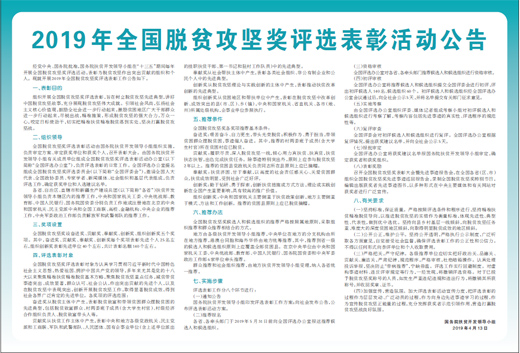 經(jīng)黨中央、國務(wù)院批準(zhǔn),國務(wù)院扶貧開發(fā)領(lǐng)導(dǎo)小組在“十三五”期間每年開展全國脫貧攻堅(jiān)獎評選活動,表彰為脫貧攻堅(jiān)作出突出貢獻(xiàn)的組織和個(gè)人?,F(xiàn)就開展2019年全國脫貧攻堅(jiān)獎評選表彰工作公告如下。