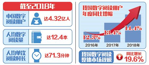 4月12日至14日,第五屆中國數(shù)字閱讀大會(huì)在杭州召開。會(huì)上發(fā)布的《2018年度中國數(shù)字閱讀白皮書》顯示,截至2018年,中國數(shù)字閱讀用戶總量達(dá)到4.32億,人均數(shù)字閱讀量達(dá)到12.4本,人均單次閱讀時(shí)長達(dá)71.3分鐘。我國數(shù)字閱讀整體市場規(guī)模已達(dá)到254.5億元,同比增長19.6%,大眾閱讀市場規(guī)模占比逾九成,是產(chǎn)業(yè)發(fā)展主導(dǎo)力量。