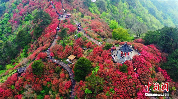 4月20日,游客在龜峰山的杜鵑花海游玩。近日,湖北省麻城市龜峰山的古杜鵑花盛開,大量游客前來賞花觀景。中新社記者 汪立敏 攝