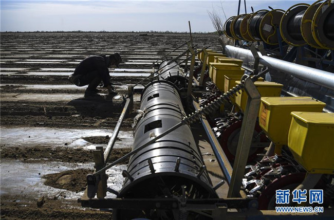 在新疆生產(chǎn)建設(shè)兵團(tuán)第六師共青團(tuán)農(nóng)場的棉花地中,一名農(nóng)場職工在一輛裝有北斗導(dǎo)航系統(tǒng)的多功能一體化無人駕駛精量播種機(jī)后檢查地膜鋪設(shè)情況(4月19日攝)。