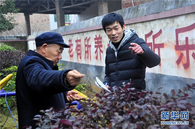2013年1月15日,在湖南省衡山縣賀家山村,畢業(yè)于美國(guó)耶魯大學(xué)的大學(xué)生村官秦玥飛(右)和當(dāng)?shù)鼐蠢显涸洪L(zhǎng)交談。新華社記者 周勉 攝