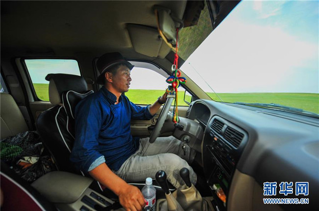 2017年7月17日,內(nèi)蒙古自治區(qū)新巴爾虎右旗克爾倫蘇木芒來(lái)嘎查黨支部書(shū)記米吉格駕車(chē)行駛在牧場(chǎng)上。新華社記者 連振 攝