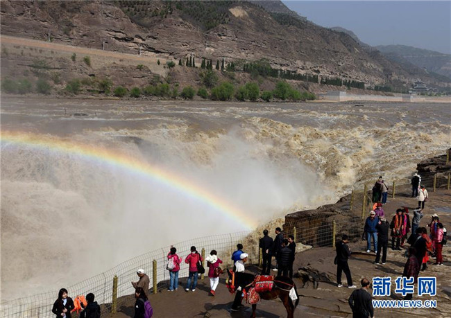 4月29日,游客在山西省臨汾市吉縣黃河壺口瀑布景區(qū)游覽。 近日,受上游降雨和水庫調節(jié)放水影響,晉陜交界的黃河壺口瀑布再現(xiàn)壯美瀑布群景觀。 新華社發(fā)(呂桂明攝)