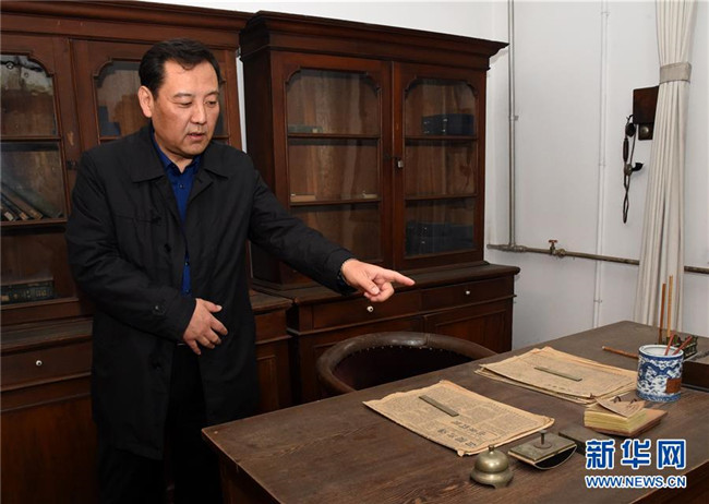 北京新文化運(yùn)動(dòng)紀(jì)念館副館長(zhǎng)李金光在北大紅樓中介紹當(dāng)年圖書館主任李大釗的辦公室(4月9日攝)。新華社發(fā)(任超 攝)
