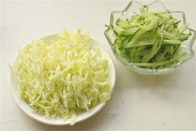2.把配菜處理一下,黃瓜切成細(xì)絲,如果刀工不好,可以借助于擦絲器,圓白菜去掉中間的莖,切成細(xì)絲。圓白菜絲用開水燙一下,再過(guò)一下涼水待用。