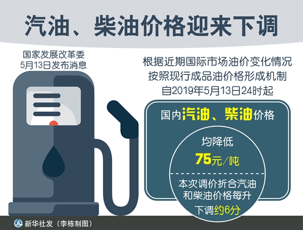 國內(nèi)汽油、柴油價(jià)格將迎來下調(diào)。國家發(fā)展改革委13日發(fā)布消息,根據(jù)近期國際市場油價(jià)變化情況,按照現(xiàn)行成品油價(jià)格形成機(jī)制,自2019年5月13日24時(shí)起,國內(nèi)汽油、柴油價(jià)格每噸均降低75元。