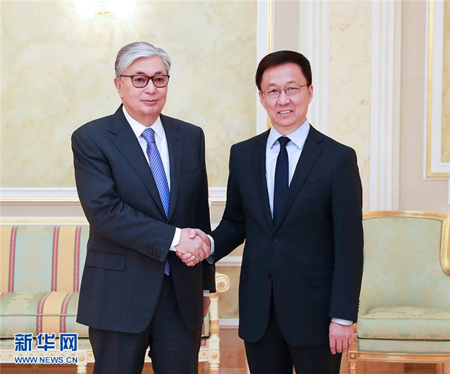 在會(huì)見托卡耶夫時(shí),韓正首先轉(zhuǎn)達(dá)了習(xí)近平主席對(duì)托卡耶夫總統(tǒng)的親切問候。韓正說,在兩國(guó)元首的戰(zhàn)略引領(lǐng)和親自推動(dòng)下,中哈全面戰(zhàn)略伙伴關(guān)系快速發(fā)展,雙方政治互信日益加深,各領(lǐng)域合作處于歷史最好水平,在地區(qū)乃至全世界樹立了睦鄰友好、互利共贏的典范。上個(gè)月習(xí)近平主席同納扎爾巴耶夫首任總統(tǒng)舉行了富有成果的會(huì)晤,向他頒授中華人民共和國(guó)“友誼勛章”,向國(guó)際社會(huì)展現(xiàn)了中哈關(guān)系的高水平和特殊性。共建“一帶一路”已成為中哈合作主線,雙方在發(fā)展戰(zhàn)略對(duì)接、合作機(jī)制建設(shè)、重大項(xiàng)目推進(jìn)等方面碩果累累。中方愿與哈方一道,繼續(xù)深化絲綢之路經(jīng)濟(jì)帶與“光明之路”新經(jīng)濟(jì)政策對(duì)接,以產(chǎn)能、貿(mào)易、互聯(lián)互通、農(nóng)業(yè)、高技術(shù)、金融合作為優(yōu)先方向,不斷提升中哈合作含金量,更好地造福兩國(guó)和兩國(guó)人民。中方祝愿哈方順利實(shí)施“2050戰(zhàn)略”,在國(guó)家發(fā)展事業(yè)中不斷取得新的輝煌成就。