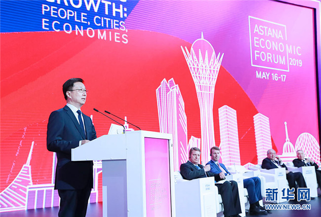 5月16日,中共中央政治局常委、國(guó)務(wù)院副總理韓正出席在努爾蘇丹舉行的第十二屆阿斯塔納經(jīng)濟(jì)論壇。 新華社記者 劉彬 攝