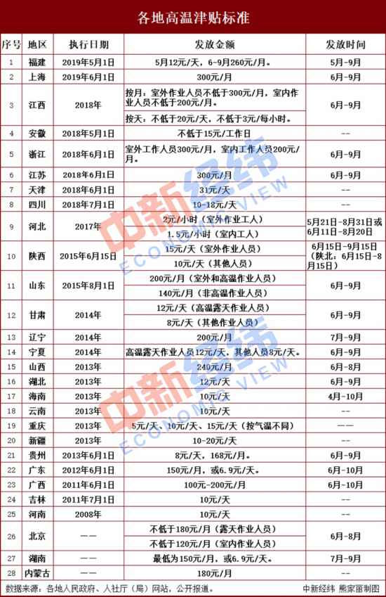中新經(jīng)緯客戶(hù)端注意到,截至2019年5月23日,部分地區(qū)的高溫津貼實(shí)施辦法已超過(guò)有效期,這些省份或可能對(duì)高溫津貼標(biāo)準(zhǔn)進(jìn)行調(diào)整。